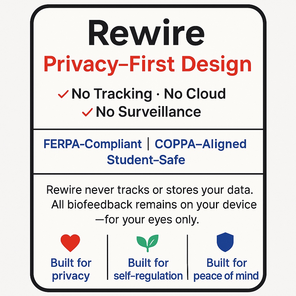 | 📱 Rewire iOS (ONLY) App | Displays real-time heartbeat in a color-coded visual. Includes trauma-informed training tools: – Sensory-based media – Masterclass series – Wellness news feed |